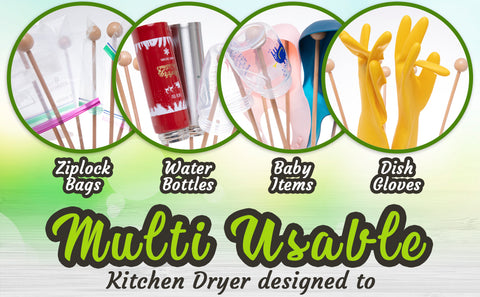 The wooden plastic bag drying rack is not just for plastic bags, but it can also dry heavy items like bottles and dish gloves. The round head on the end of the dowels is designed to keep the bottles and dish gloves secure and upright while they dry, ensuring they dry evenly and quickly. This versatile kitchen tool is perfect for those looking to reduce waste and save money.