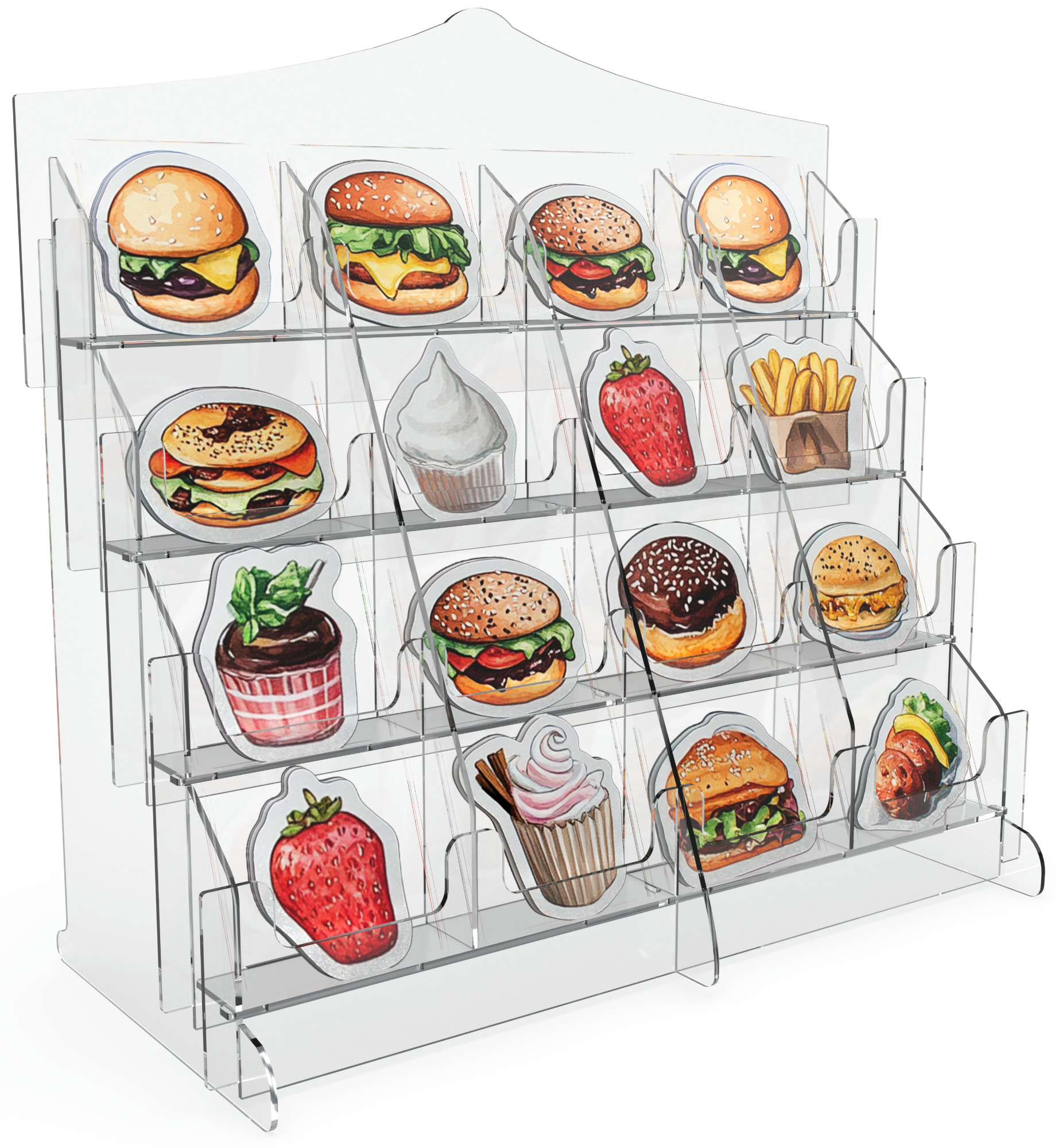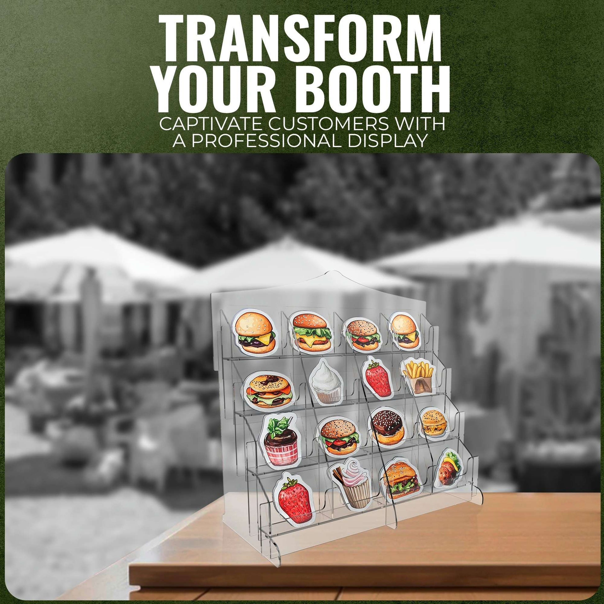 - Showstopper Design - Boasting 4 levels with a distinctive curved pocket shape, it accommodates 16 sticker varieties at a glance. Scientifically crafted to enhance visibility, this retail stand is your secret tool to elevate sales and make your booth an instant standout!