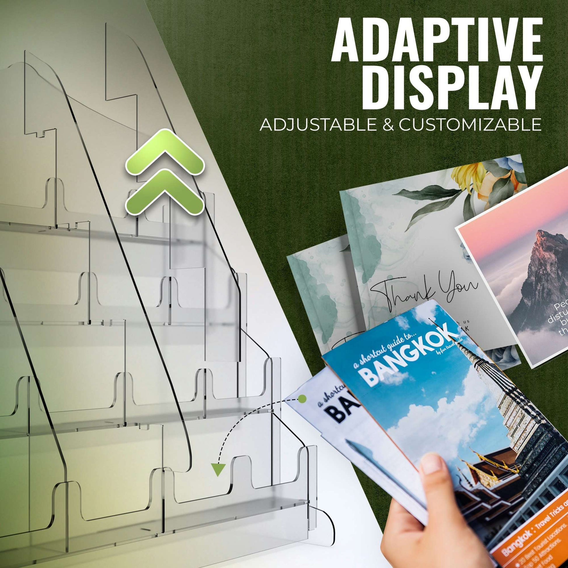 - Adaptable and Spacious - Each pocket (Width: 4’’ x Height: 3.8’’ x Depth: 1.37’’) is a canvas for your creativity. Remove the partition board to transform the stand into a versatile display for different-sized greeting cards, flyers, brochures, and pamphlets in vendor events. One stand, countless possibilities!
