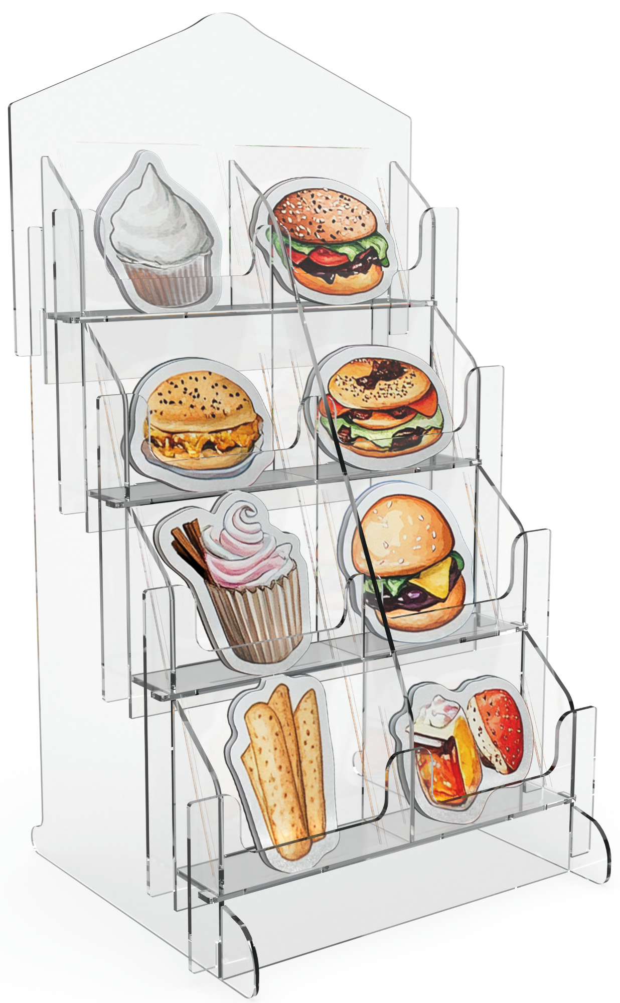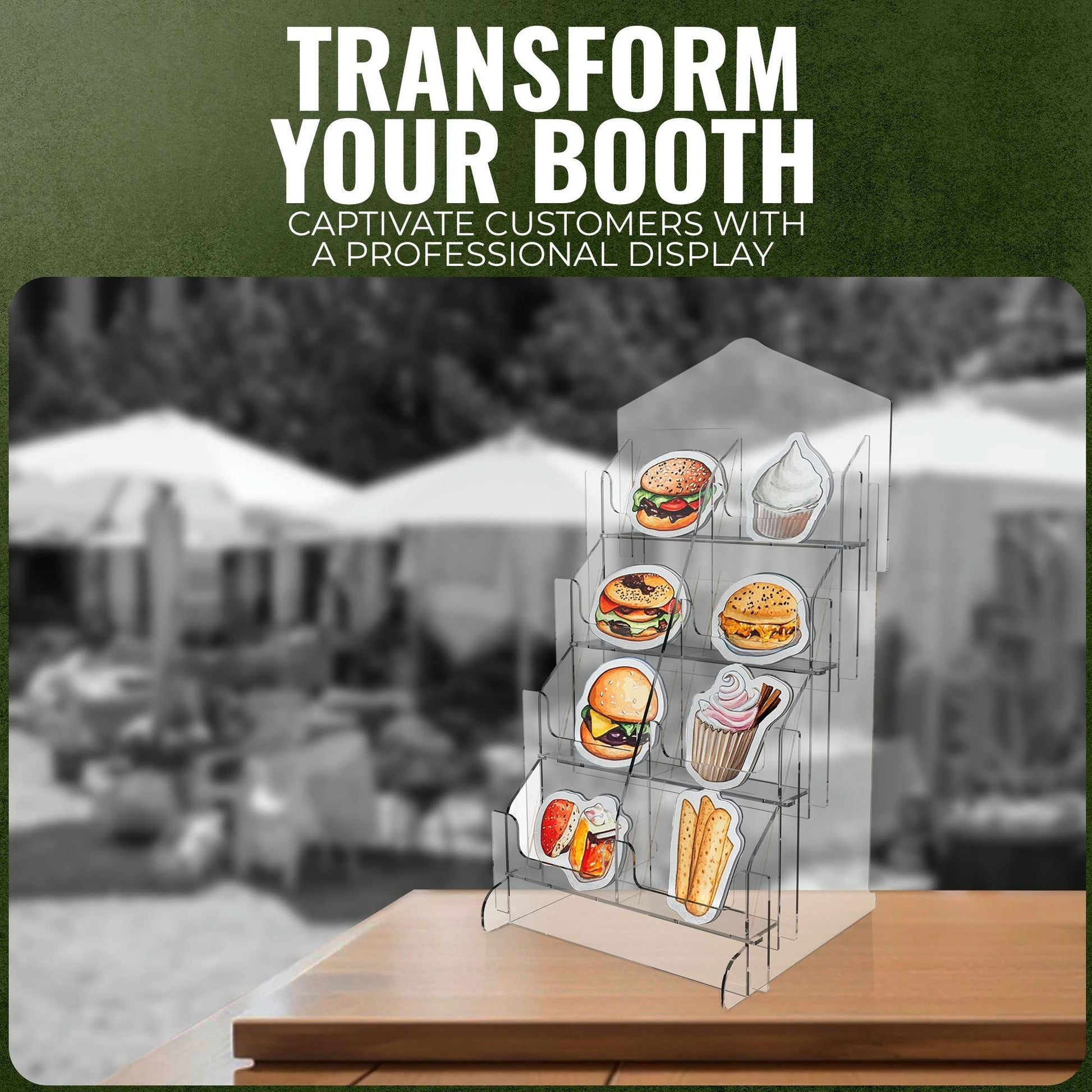 - Showstopper Design - Boasting 4 levels with a distinctive curved pocket shape, it accommodates 16 sticker varieties at a glance. Scientifically crafted to enhance visibility, this retail stand is your secret tool to elevate sales and make your booth an instant standout!