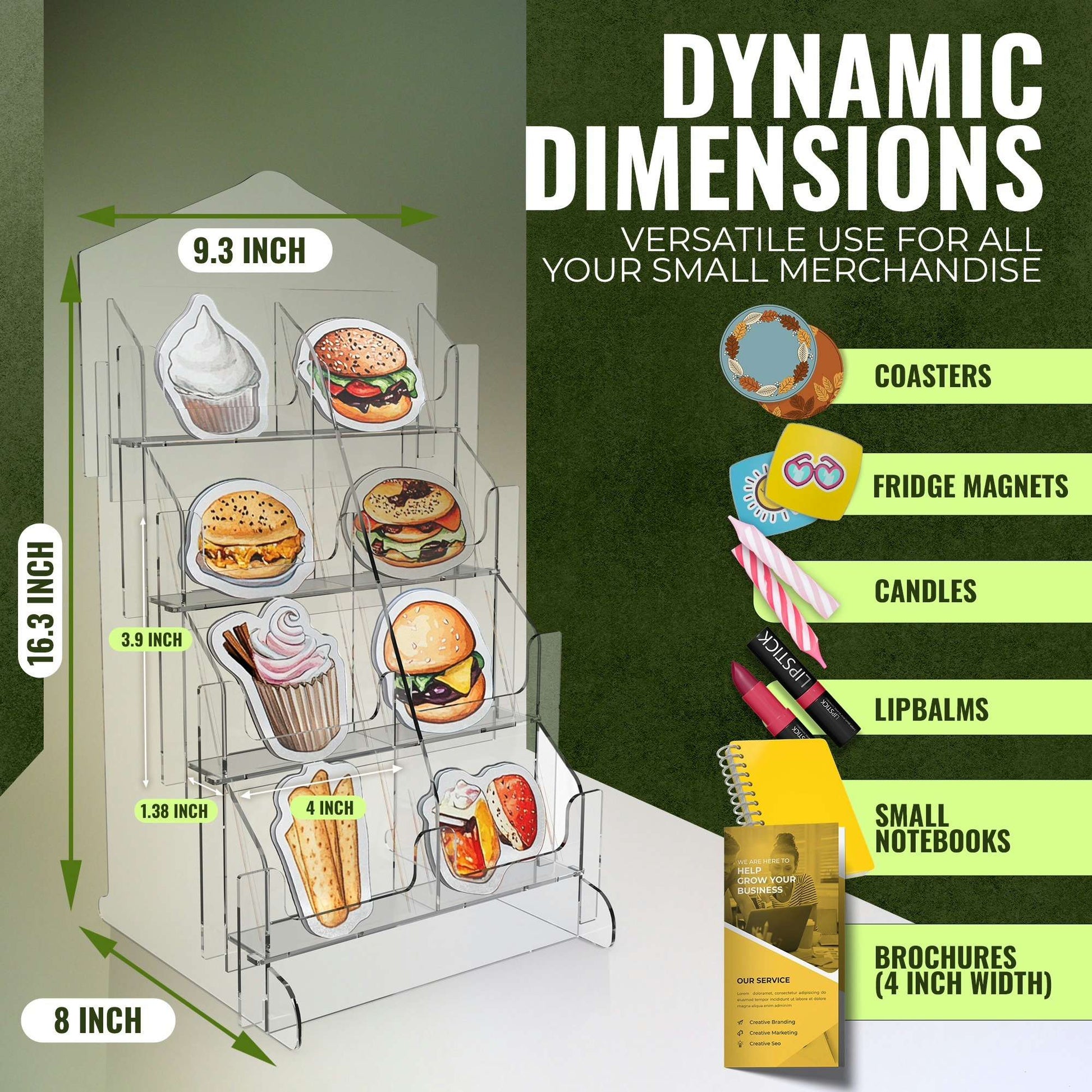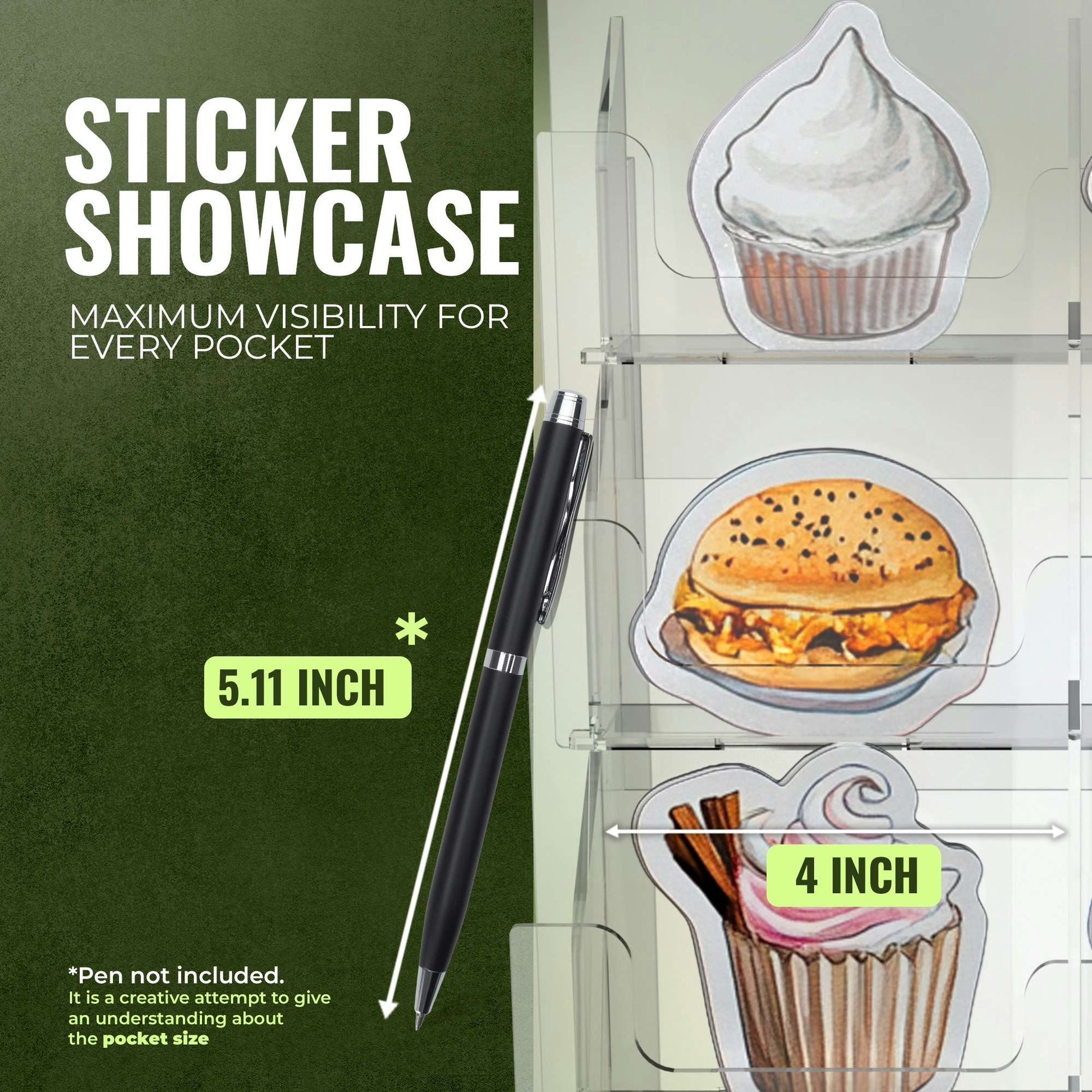 Acrylic Sticker Display Stand with Curved Pockets for Big 4'' Stickers- Brochure Holder with Customizable Space - On the Go Display Stands for Vendor Events - Ideal for Small Business Vendors (Small)