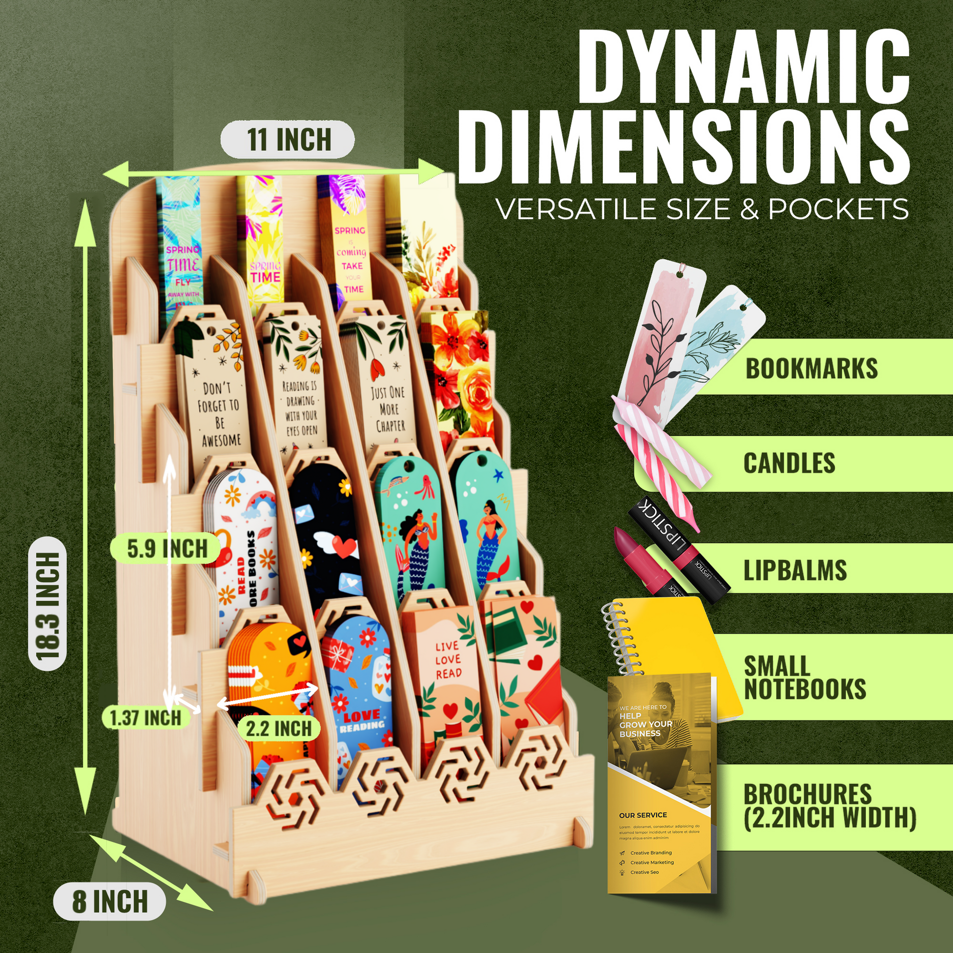 - Eye-Catching Design – With 4 stepped tiers and unique engraving pocket shapes, this bookmark holder display accommodates up to 16 bookmark varieties. Scientifically crafted to enhance visibility, this bookmark display stand for vendors is designed to boost revenue and make your booth capture attention.