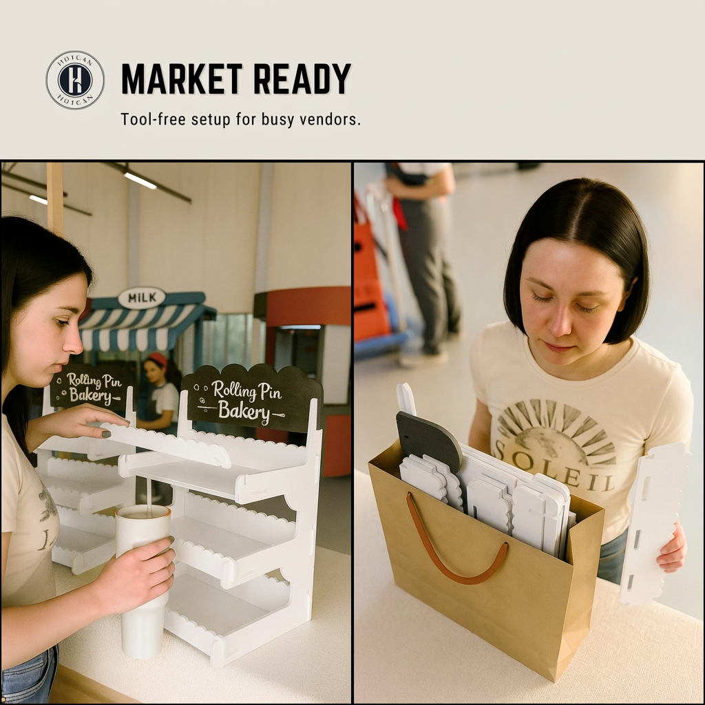 - Effortless Setup & Pack-Up - Designed for busy vendors, this stand assembles tool-free in minutes and breaks down flat for quick transport. Strong plywood construction ensures your cookie display stand is sturdy enough for a full market day yet easy to carry home.