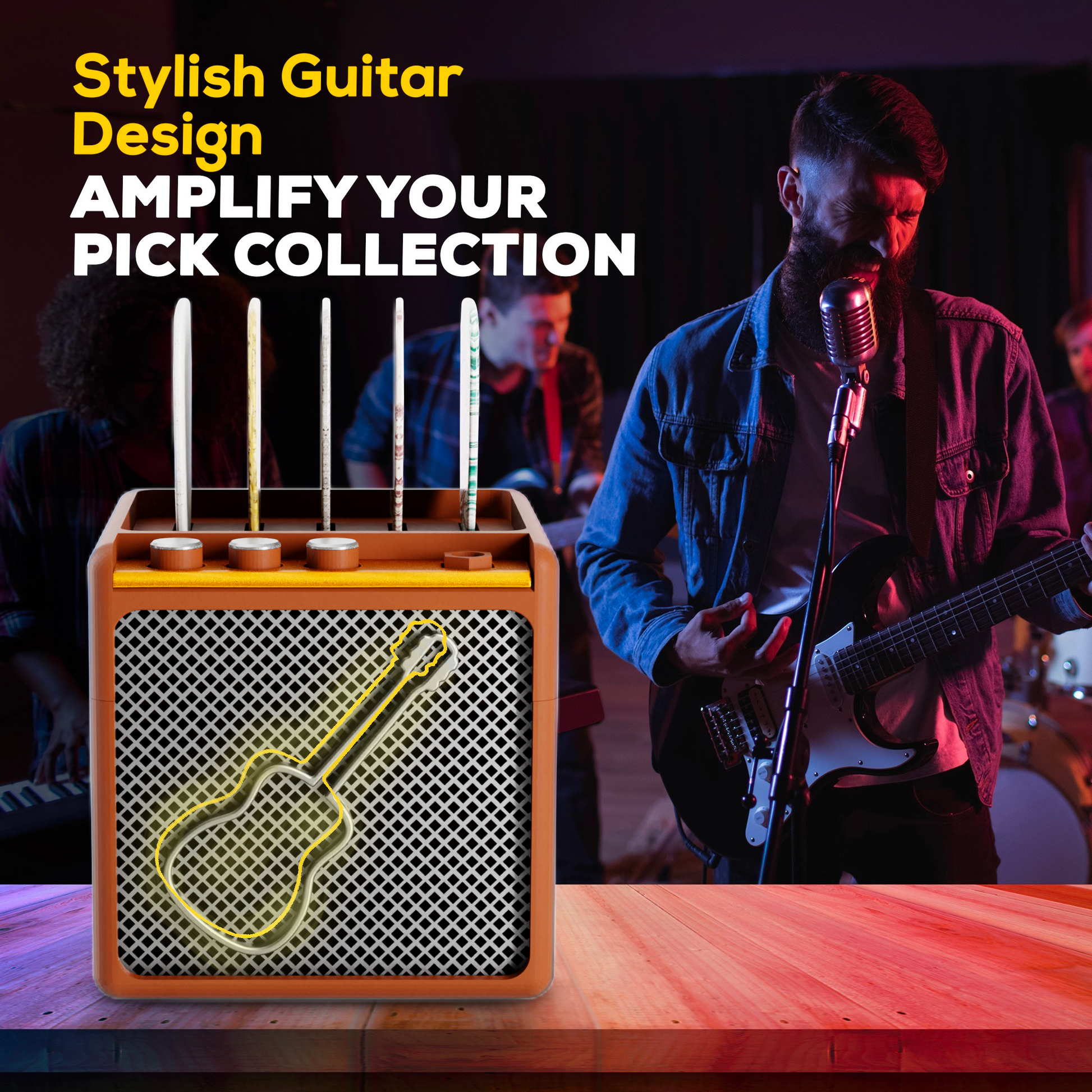 - Guitar Amplifier Design: This guitar pick holder features a unique amplifier shape, making it a standout piece for any music lover or musician. A great addition to your guitar decor and guitar stuff collection.