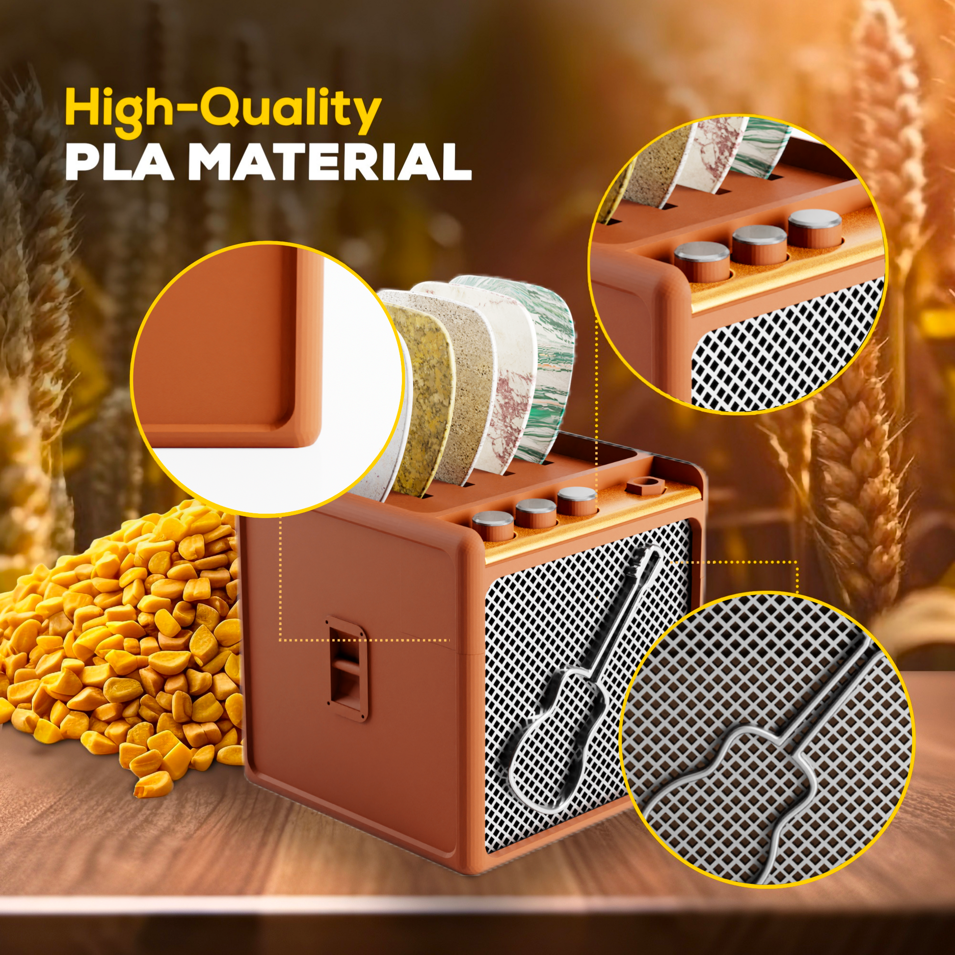 - Sturdy PLA Material: Made from quality PLA material, this pick holder ensures long-lasting use. The black box, gold panel, and silver mesh details showcase its craftsmanship, making it an excellent guitar display case.