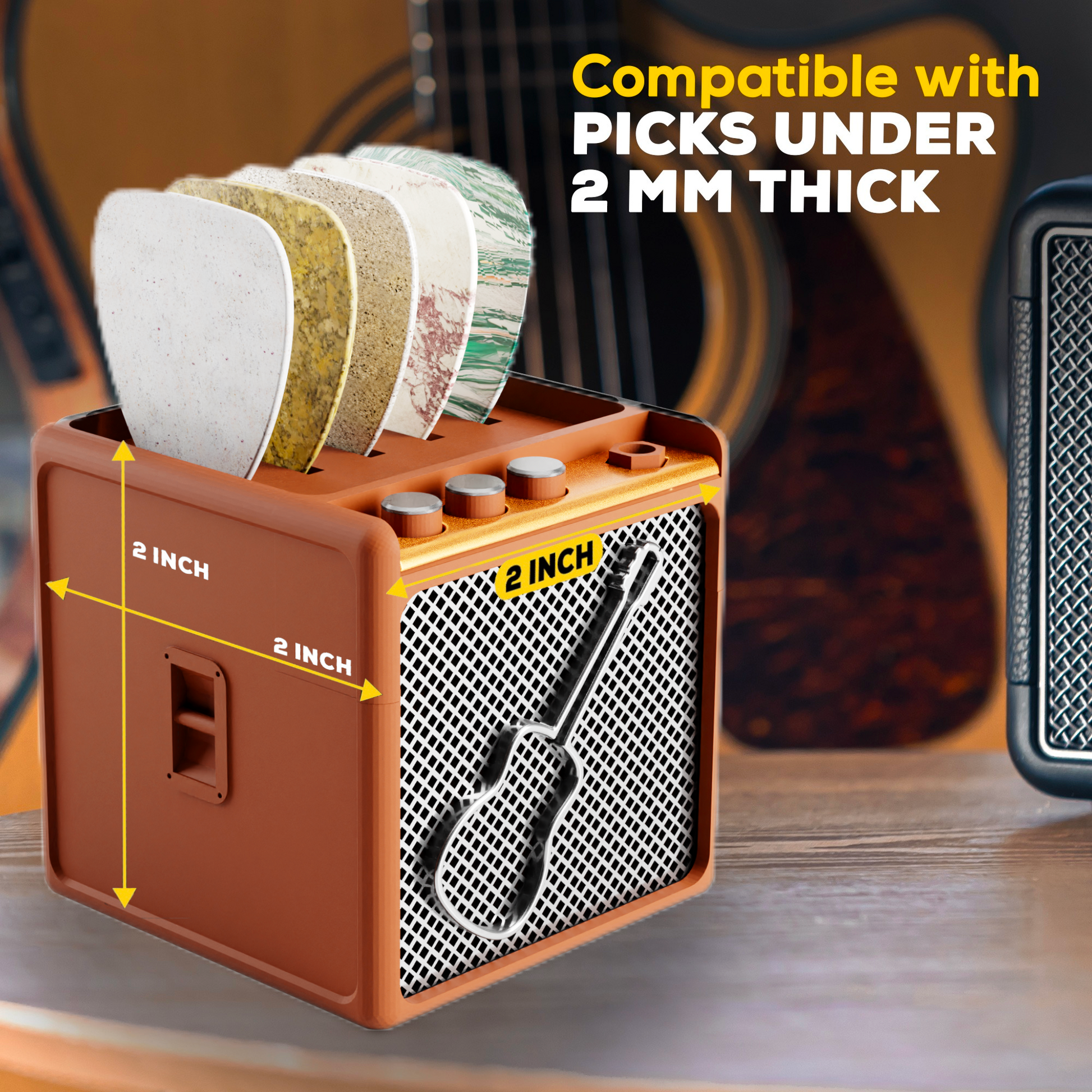 - Functional and Neat: At 2" x 2" x 2", this holder fits well on any desk, music stand, or display shelf. It organizes up to five individual guitar picks securely in a tidy guitar pick box.