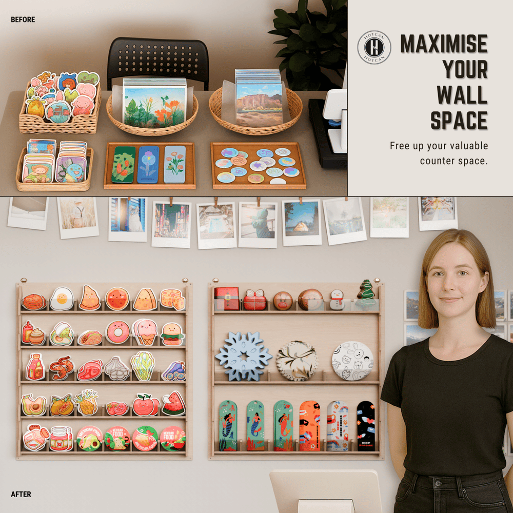 - SAVE COUNTER SPACE & STAY ORGANIZED – As a busy vendor or classroom teacher, you need every inch of space. This wall-mounted sticker display stand clears your countertop instantly, giving your shop or classroom a clean, professional look.